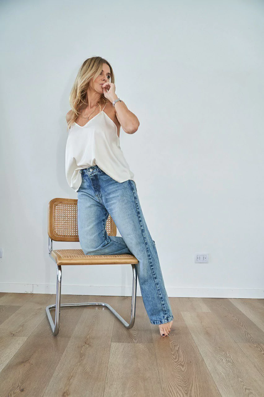 Jean wide leg / Tono azul / Boton metalico en cintura